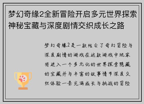 梦幻奇缘2全新冒险开启多元世界探索神秘宝藏与深度剧情交织成长之路